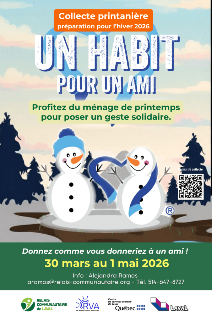 Le Relais communautaire de Laval organise chaque année la grande collecte d’hiver « Un habit pour un ami » avec le soutien de la Ville de Laval, du Centre de services scolaire de Laval et du Rendez-vous des Aînés. Ensemble, nous pouvons transformer l’hiver grâce à vos dons !